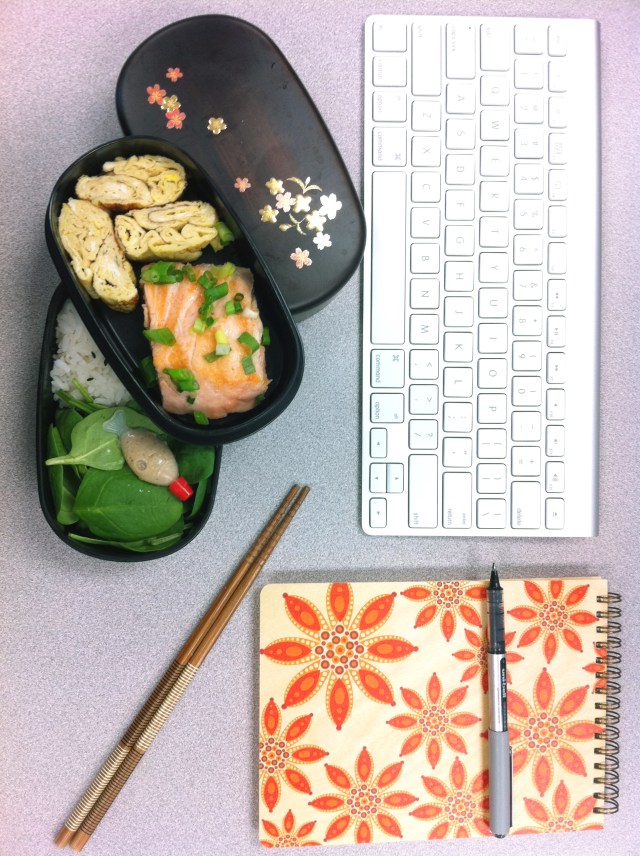 Grilled salted salmon, tamago (egg), baby spinach salad with roasted sesame dressing and rice with black sesame seeds.