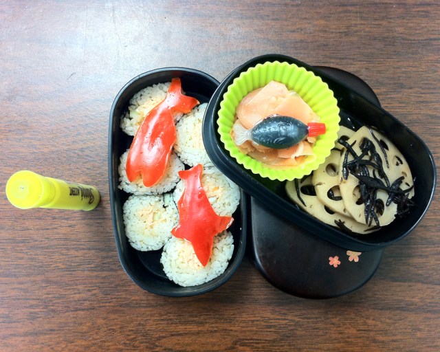 Koreanese bento #4: Oceanography 101 Standard Salmon and cucumber roll with braised lotus root, pickled ginger and bell pepper whale and shark. Share this: Click to email a link to a friend (Opens in new window) Email Click to print (Opens in new window) Print Click to share on Facebook (Opens in new window) Facebook Click to share on X (Opens in new window) X Click to share on Pinterest (Opens in new window) Pinterest Click to share on Tumblr (Opens in new window) Tumblr Like Loading... Related