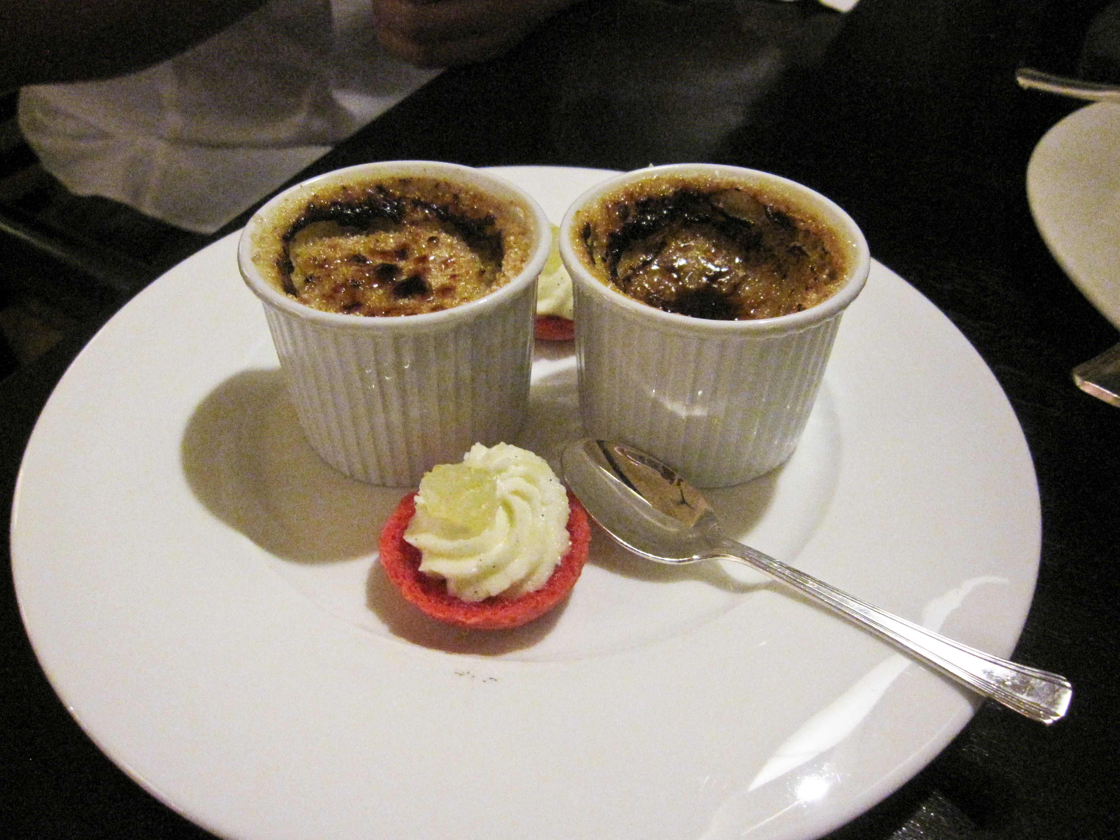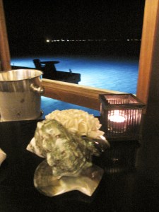 Gratis creme brulee for dessert. We had a lovely French expat waiter, and it was magical to watch the fishies swim in the lights over the lagoon.