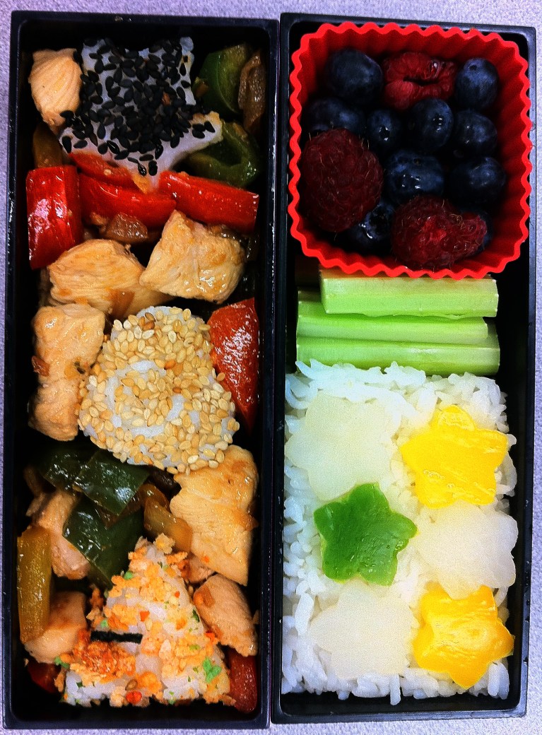 Chicken and bell pepper stirfry, celery sticks, fresh berries, daikon and assorted onigiri (black-sesame star, roasted-sesame heart and kimchee-furikake encrusted triangle)
