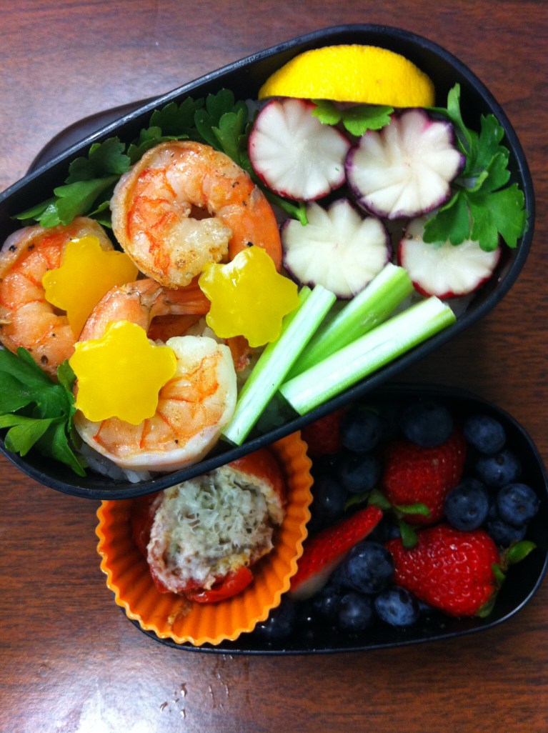Koreanese bento #9: Butter shrimp and happy flowers Standard Koreanese bento #9: Butter shrimp, radish tulips, bell pepper flowers, celery stems and parsley leaves over rice; baked parmesan tomatoes and fresh berries. Share this: Click to email a link to a friend (Opens in new window) Email Click to print (Opens in new window) Print Click to share on Facebook (Opens in new window) Facebook Click to share on X (Opens in new window) X Click to share on Pinterest (Opens in new window) Pinterest Click to share on Tumblr (Opens in new window) Tumblr Like Loading... Related