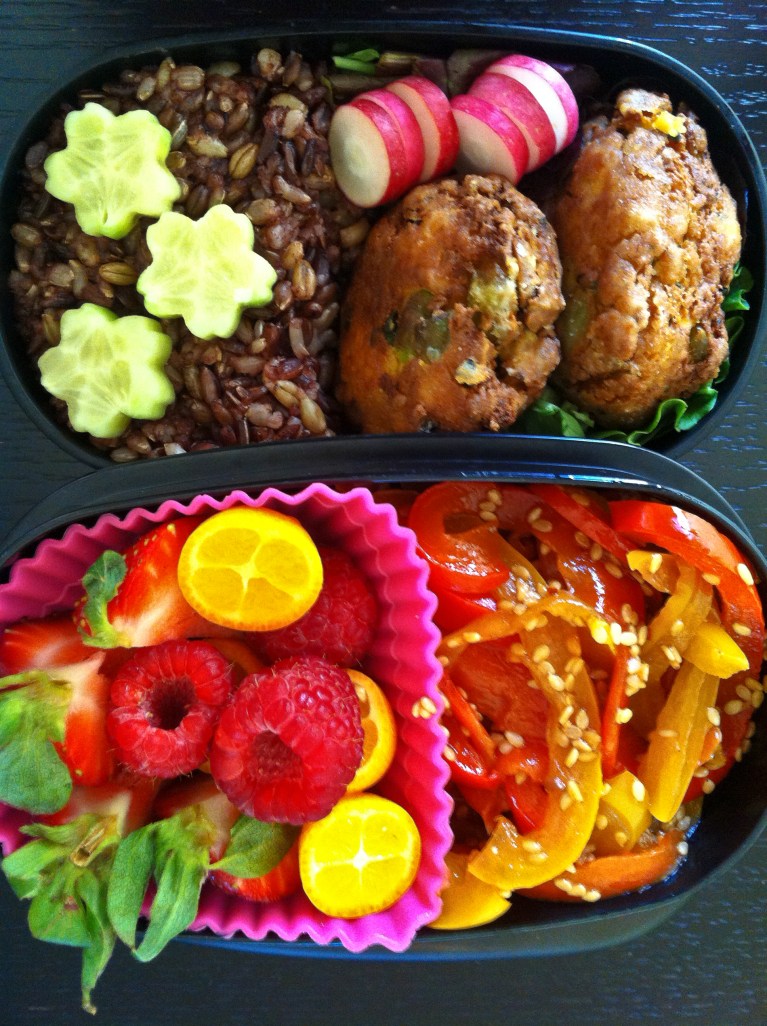 Fried tofu and edamame nuggets with baby lettuce, radishes, cucumbers and multigrain rice; bell pepper kinpira and a berry-citrus fruit salad for dessert.