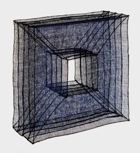 "Matrix 0909" by Yeon-Soon Chang; Abaca fiber, indigo dye, machine sewn, 13.4in x 13.2in x 5.3in