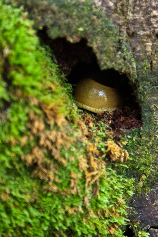 A banana slug nestles in the moss-covered nook of a fallen redwood tree. Prairie Creek Redwoods State Park, Calif.