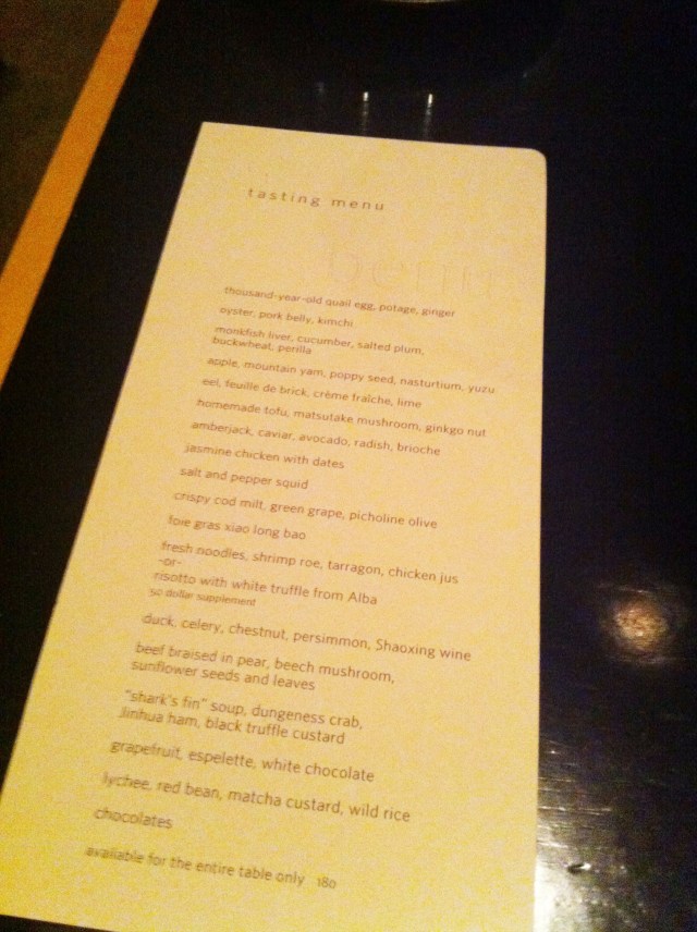 We committed to the full tasting menu, and what a delightful (and very expensive) ride! For $180 per person (and the whole table must join in), we consumed an amuse bouche, 19 dishes plus an exquisite piece of birthday cake. Highlights included oyster and pork belly with kimchi; eel in feuille de brick with creme fraiche and lime; foie gras xiao long bao; beef braised in pear, beech mushroom, sunflower seeds and leaves; and lychee and red bean with matcha custard and wild rice.