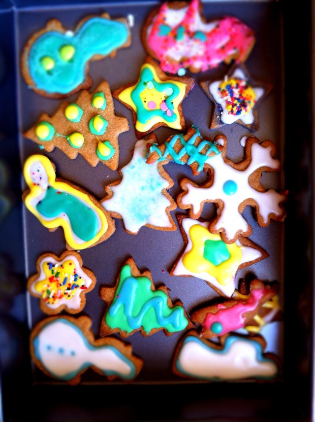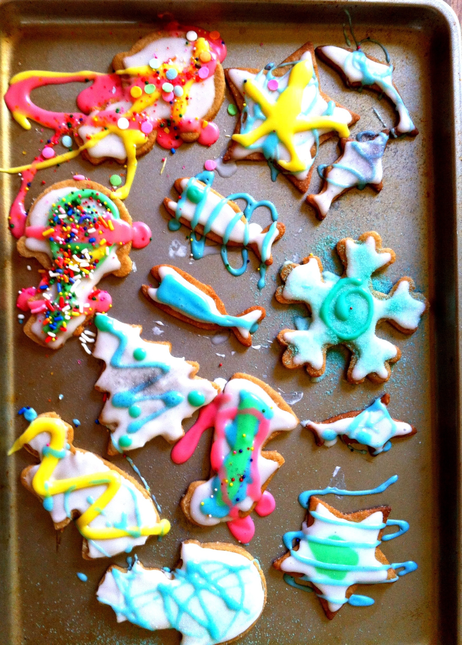 In light of the fact that this was Dec. 26 and also in honor of a trip to the SF MoMA earlier that day, we decided to forgo traditional Christmas colors (and cookie-decorating principles in general). We covered ourselves in bright pink and electric blue sugary icings well into the night and gave ourselves stomach aches sampling the goods. A very merry post-modern, post-Christmas cookie time, indeed.