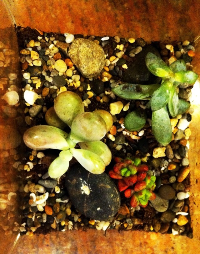I recently redid a few planters, as I hadn’t given them proper drainage on my first try. Now, with a bed of rocks in the bottom and a layer of charcoal just below the sandy soil, the roots should have plenty of room to breathe.