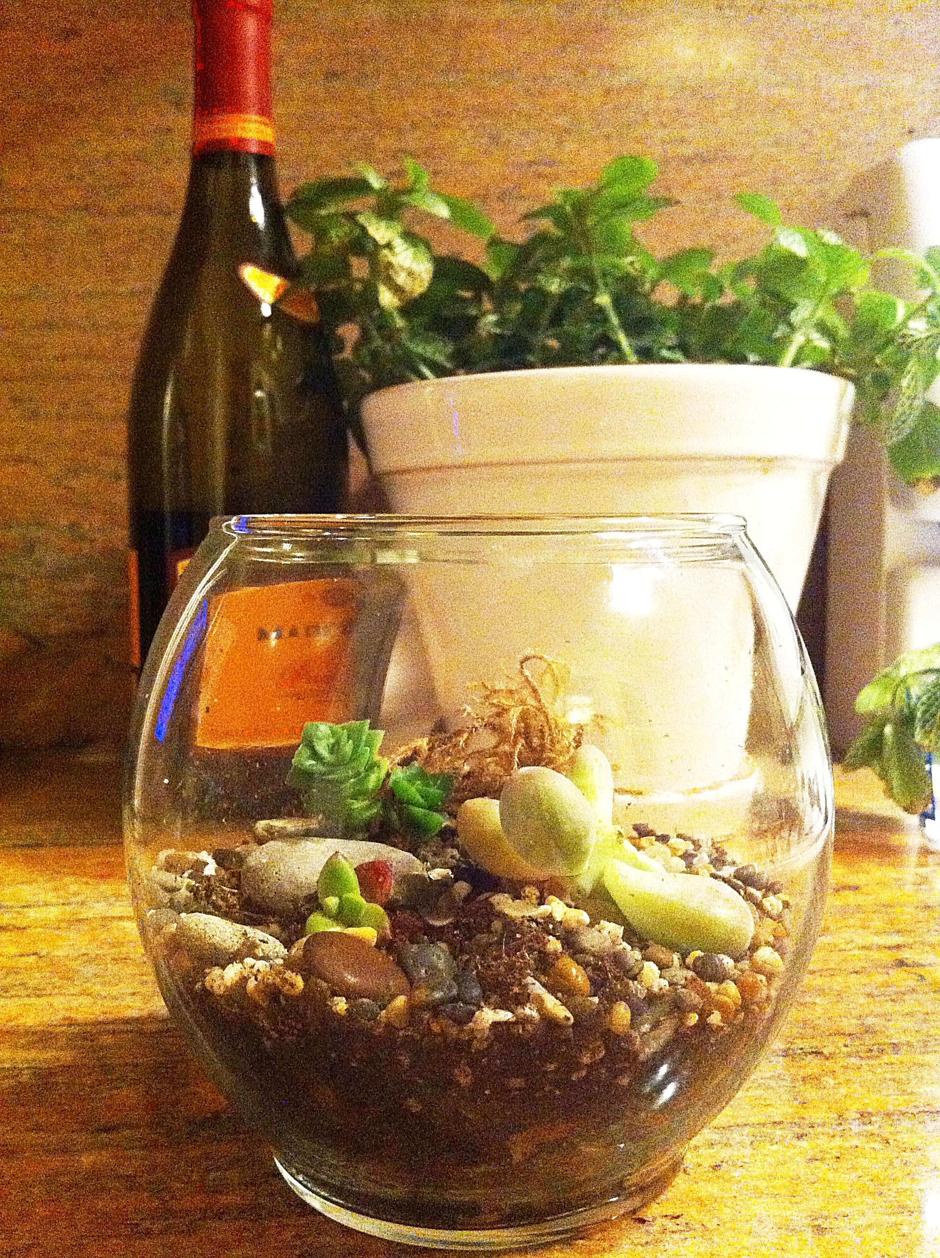 Finding the right containers is almost equally as fun. I peruse secondhand stores, sale bins and my own cabinets for candidates. (What better retirement plan for a chipped mug or bowl?) Fishbowls are a present favorite.