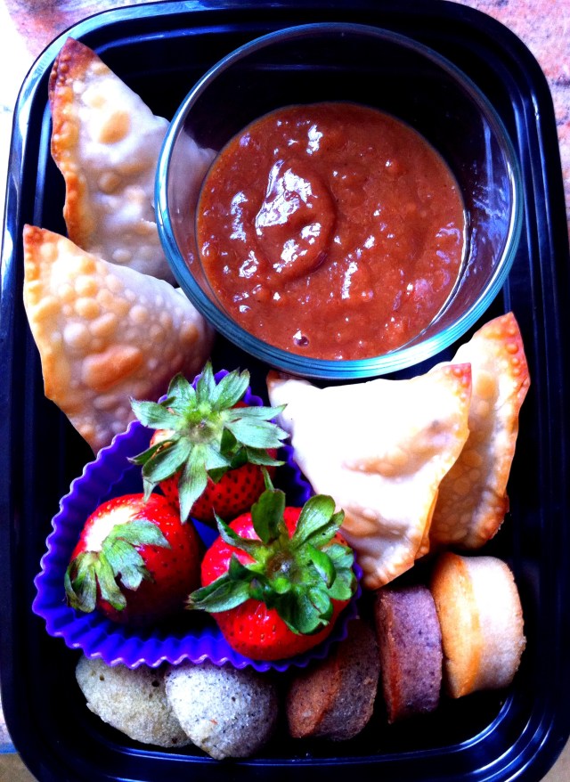 I tossed together this snack of leftover samosas, fruit and pastries in less than five minutes, and they’re in a re-used Chinese take out container to boot. So here’s one for the imperfectionist in all of us. Cheers! And happy snacking.