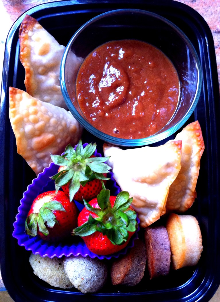 Potato-and-pea baked samosas with tamarind-date chutney, fresh strawberries and Asian-flavored financiers and madeleines by SweetMue.com.
