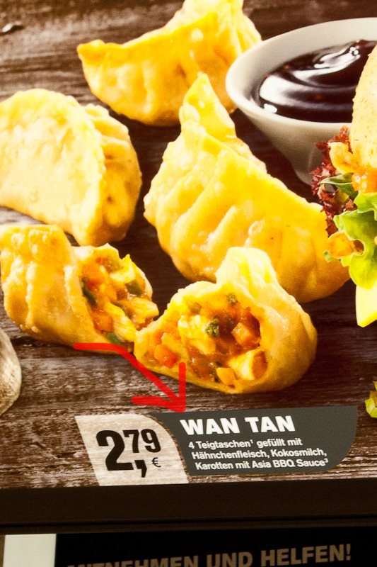 Is “wan tan” how one says “won ton” in German? Is this preferable to “potsticker” or “dumpling,” which is the German word they chose for the caption? Does anyone really care? Most likely not. But thought I would ruminate nonetheless. Hey, this is my blog!